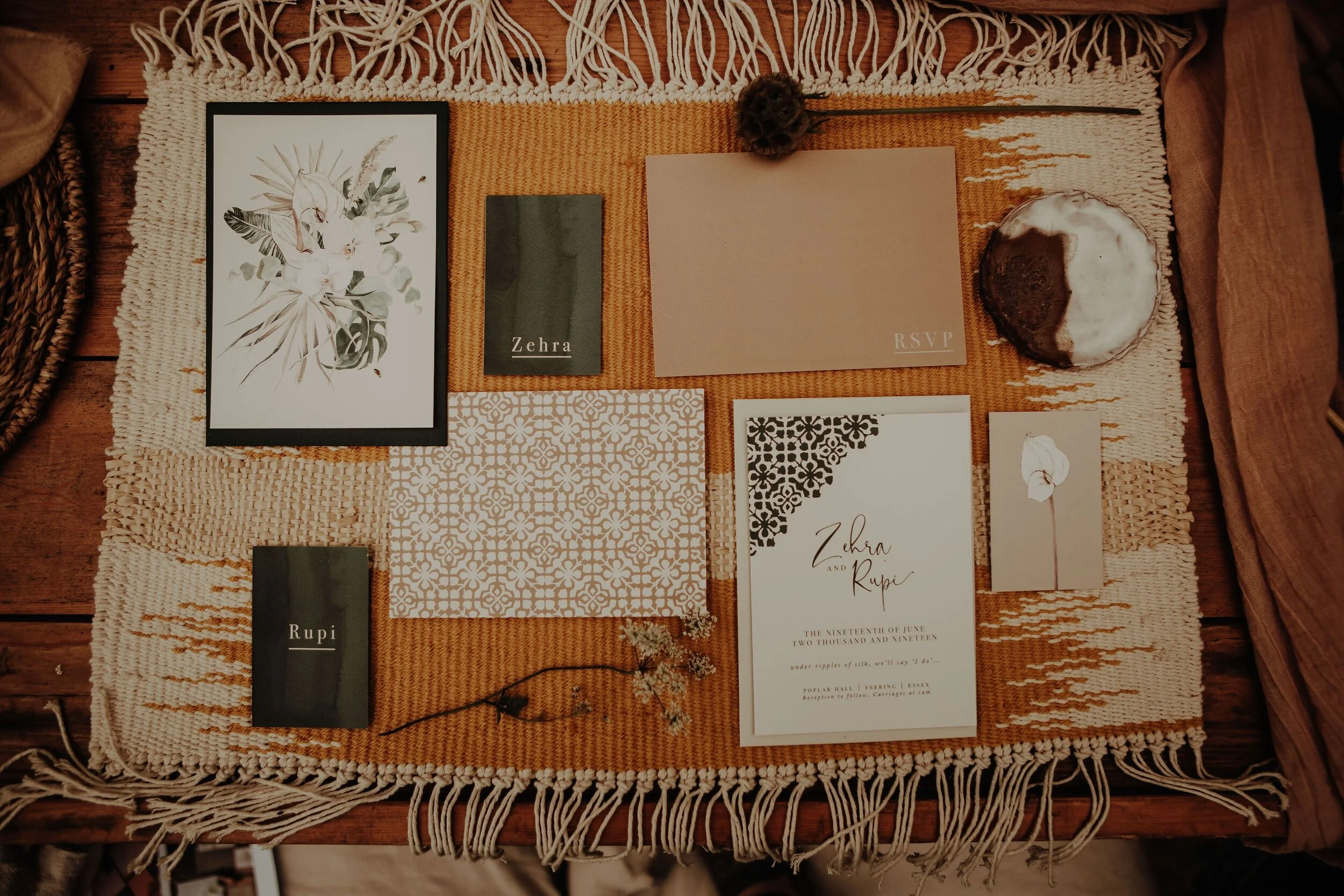This Modern Rustic styled wedding shoot by Festival Brides and Lo and Behold Bespoke, photographed by The Wild Bride features my yugen placemats, meraki earrings and textile copper moons. See the full shoot and suppliers on Festival Brides.